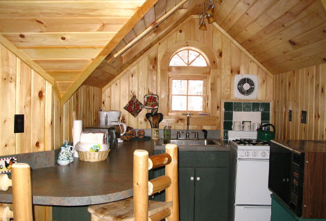 Fridge, microwave, toaster oven, 4 burner gas range/oven, coffeemaker, cookware, utensils, dishes, overhead track lighting, skylight, custom Adirondack cedar barstools at counter.